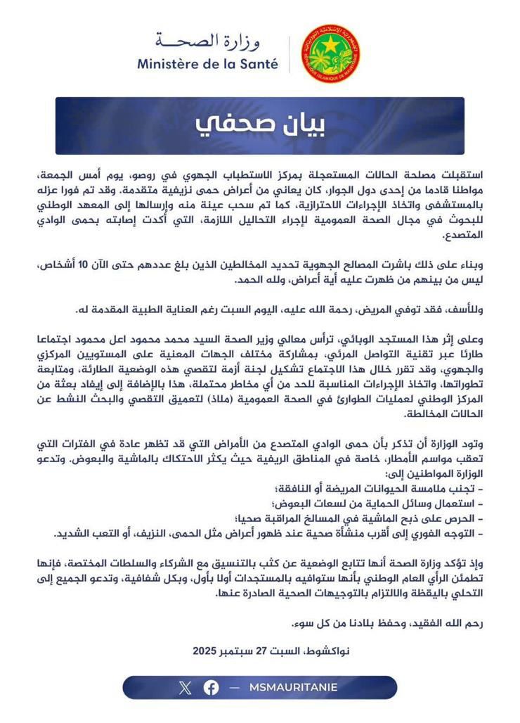 وزارة الصحة تعلن تسجيل حالة وفاة بحمى الوادي المتصدع في مدينة روصو