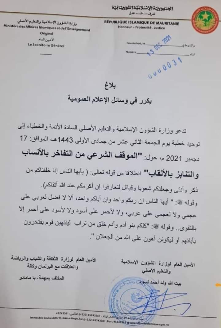 دعوة لتوحيد خطبة الجمعة حول موقف الشرع من "التفاخر بالانساب و التنابز بالألقاب"