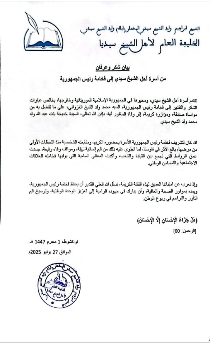 أسرة أهل الشيخ سيديّ تشكر رئيس الجمهورية على مواساتها خلال محنة رحيل أحد أفرادها