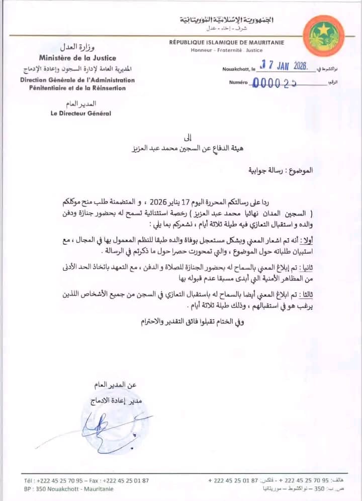 ووفق رسالة وجهها المدير العام لإدارة السجون إلى هيئة دفاع ولد عبد العزيز، فقد سمح أيضا للرئيس السابق باستقبال التعازي في السجن من جميع الأشخاص الذين يرغب هو في استقبالهم وذلك طيلة ثلاثة أيام.