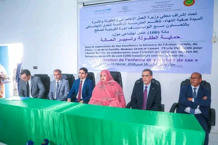 أشرفت وزيرة العمل الاجتماعي والطفولة والأسرة، صفية انتهاه، رفقة وزير تمكين الشباب والرياضة والخدمة المدنية، محمد عبد الله ولد لولي، ووالي نواكشوط الغربية، حمود ولد امحمد، اليوم الخميس بمباني المدرسة الوطنية للعمل الاجتماعي في نواكشوط، على افتتاح دورة تكوينية لصالح 100 عامل اجتماعي حول حماية الطفولة وتسيير الحالة.