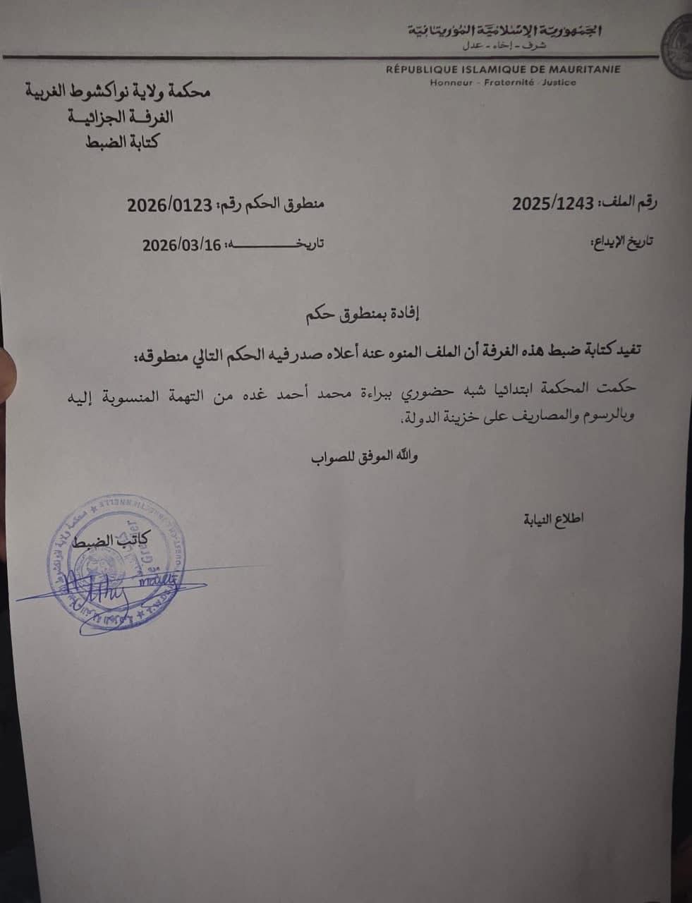 أصدرت الغرفة الجزائية بمحكمة ولاية نواكشوط حكمًا ببراءة السيناتور السابق ورئيس منظمة الشفاية الشاملة محمد ولد غده من التهم المنسوبة إليه.