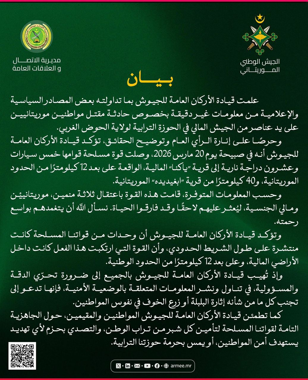 أصدرت قيادة الأركان العامة للجيوش، اليوم، بيانا نفت فيه ما تم تداوله من معلومات وصفتها بغير الدقيقة حول مقتل مواطنين موريتانيين على يد عناصر من الجيش المالي في المنطقة الحدودية.