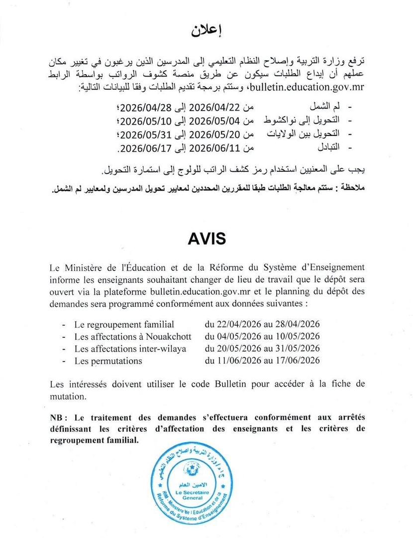 وأوضحت الوزارة أن إيداع الطلبات سيتم حصريًا من خلال الرابط: bulletin.education.gov.mr، باستخدام رمز كشف الراتب للولوج إلى استمارة التحويل.