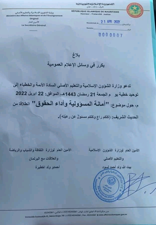 دعت وزارة الشؤون الإسلامية والتعليم الأصلي، في بيان صادر عنها اليوم الخميس، الأئمة والخطباء إلى توحيد خطبة يوم الجمعة 21 رمضان 1443 الموافق 22 إبريل 2022، حول موضوع "أمانة المسؤولية وأداء الحقوق"، انطلاقا من الحديث الشريف "كلكم راع وكلكم مسؤول عن رعيته".